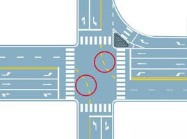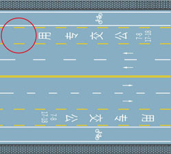 2. 図が示す円中の黄色い破線は、なにを示す路面標示か。